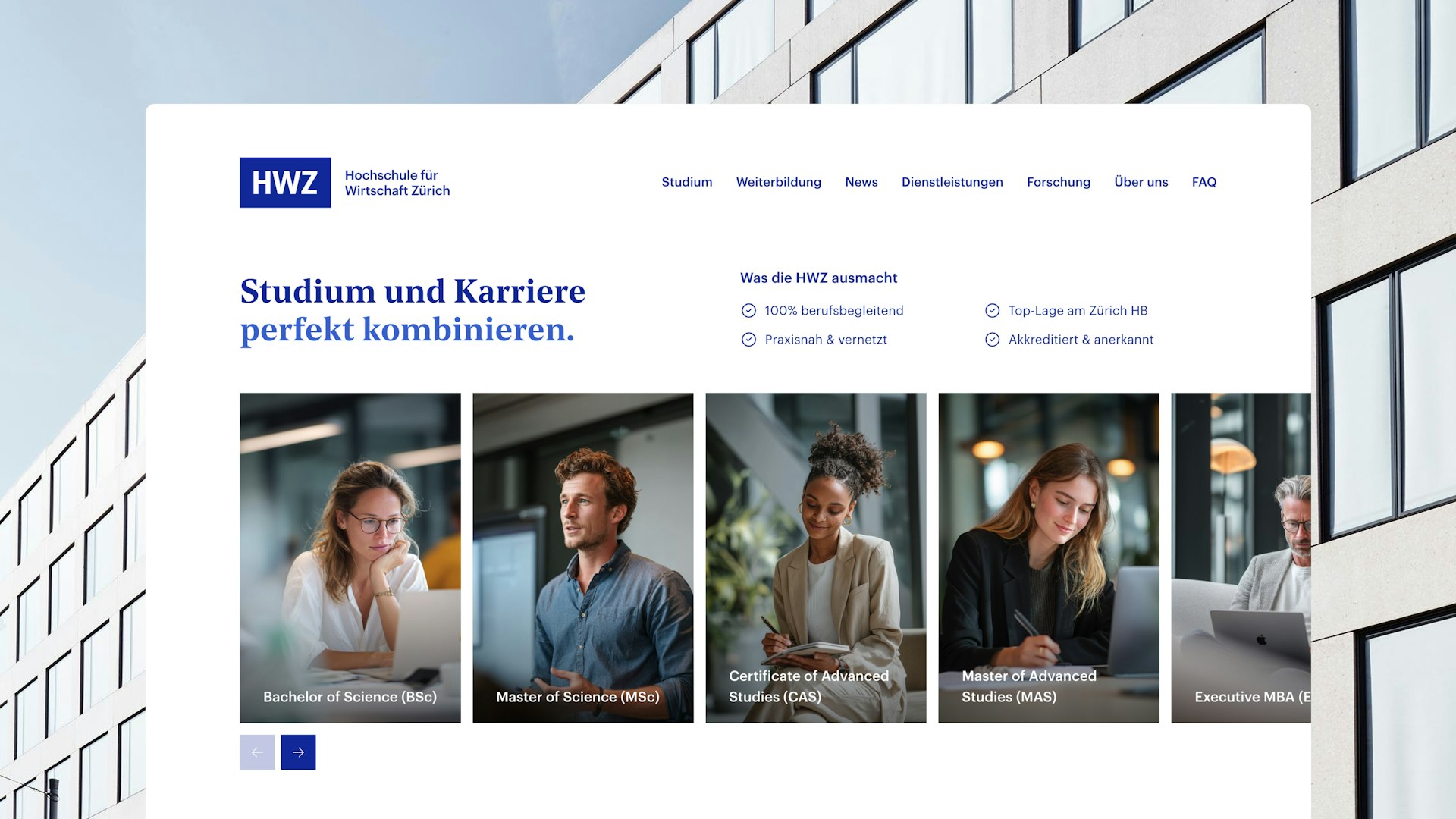 Im Rahmen dieses Projekts wurde die bestehende Webseite der HWZ Hochschule für Wirtschaft Zürich technisch und gestalterisch vollständig erneuert.